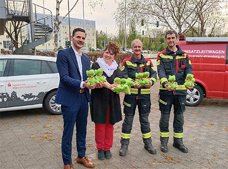 Die Freiwillige Feuerwehr Strausberg hat von der Sparkasse Märkisch-Oderland einen Schwung Kuscheltiere gesponsert bekommen. Sie wurden am Dienstagabend (9. April 2024) am Gerätehaus von Sparkassen-Vorstandschef Thomas Beutler und seiner Kollegin Manuela Baumgärtner an Stadtbrandmeister Uwe Schmidt und Strausbergs Ortswehrführer Bastian Petzold übergeben.